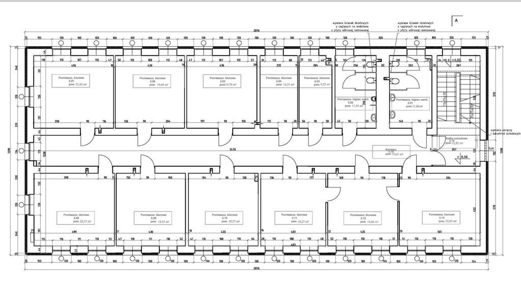 - trzecie piętro 10 pomieszczeń biurowych, 2 toalety, pomieszczenie socjalne.