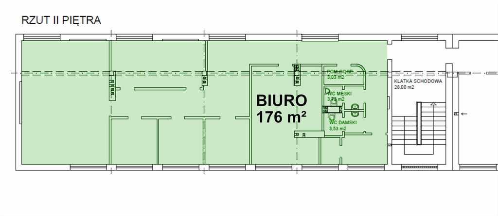• Kompleks biurowy o łącznej powierzchni 176 m2 na 2 piętrze składa się z 6 pomieszczeń biurowych, dwóch toalet, kuchenki, pomieszczenia z prysznicem, korytarza oraz niewielkiego schowka.